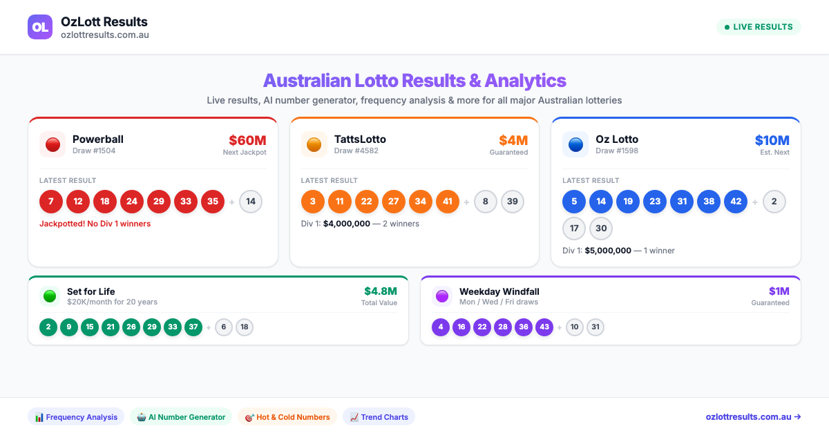 Oz Lotto is drawn every Tuesday at 8:30pm AEST with a guaranteed Division 1 prize of $2 Million. 7 winning numbers from 45 plus 3 supplementary. Odds: 1 in 45,379,620.